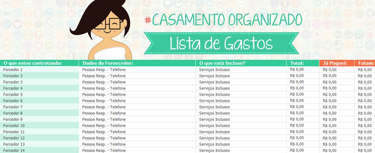 A lista que eu fiz foi bem simples. Ela consta com espaço para 20 fornecedores (que você pode aumentar facilmente caso haja necessidade). Nela você tem espaço para por: "Nome do Fornecedor", "Pessoa Responsável" e "Serviços Inclusos". Daí vem o "Total" e a parte "Já Paguei". Toda vez que você inserir um valor nessa área, automaticamente o "Faltam" é alterado.