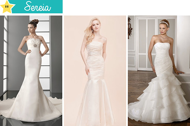 1 - Estilo Sereia ou Corte Sereia: o vestido Estilo Sereia tem a cintura e quadril bem ajustados e a barra larga que lembra uma cauda de sereia. É o queridinho de muitas noivas.