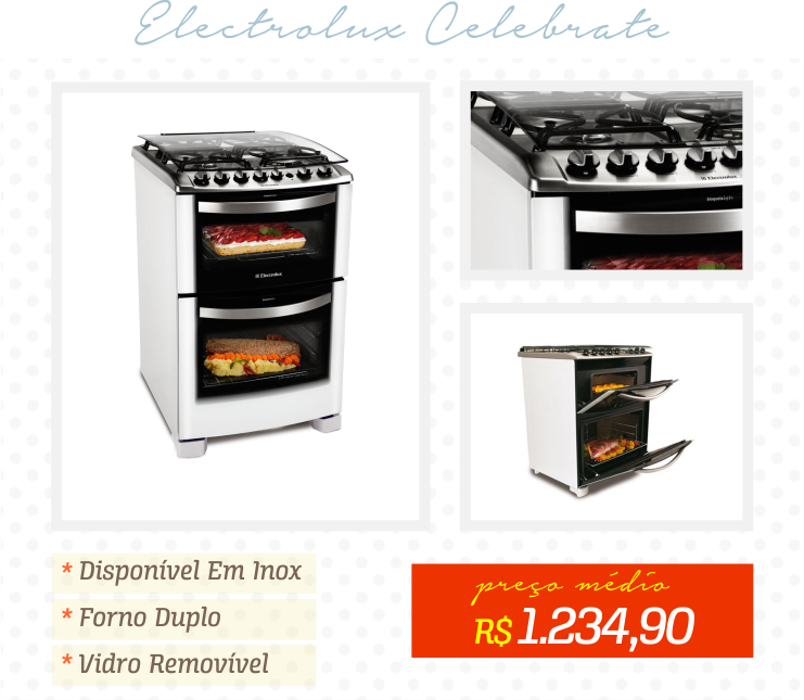Fogão Electrolux: Além da disponibilidade em inox (o que pode deixar sua coxinha ainda mais legal) ele possuí forno duplo. Pra quem gosta de ser rápido na cozinha e fazer várias coisas ao mesmo tempo vale muito a pena. Com certeza pra mim não valeria apena, não sou do tipo de pessoa que cozinha muito então nunca iria usar o segundo forno :(