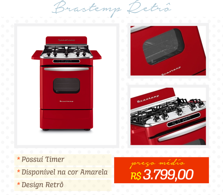 Brastemp Retrô: Eu tenho uma certa queda por itens retro então esse é o que mais me chama atenção, esse fogão também está disponível na cor amarela e além do design ele possuí timer, ou seja adeus comidinhas queimadas hahaha. O preço é um pouco alto, mas se você quer investir na sua cozinha e deixar ela linda, vale a pena a escolha!